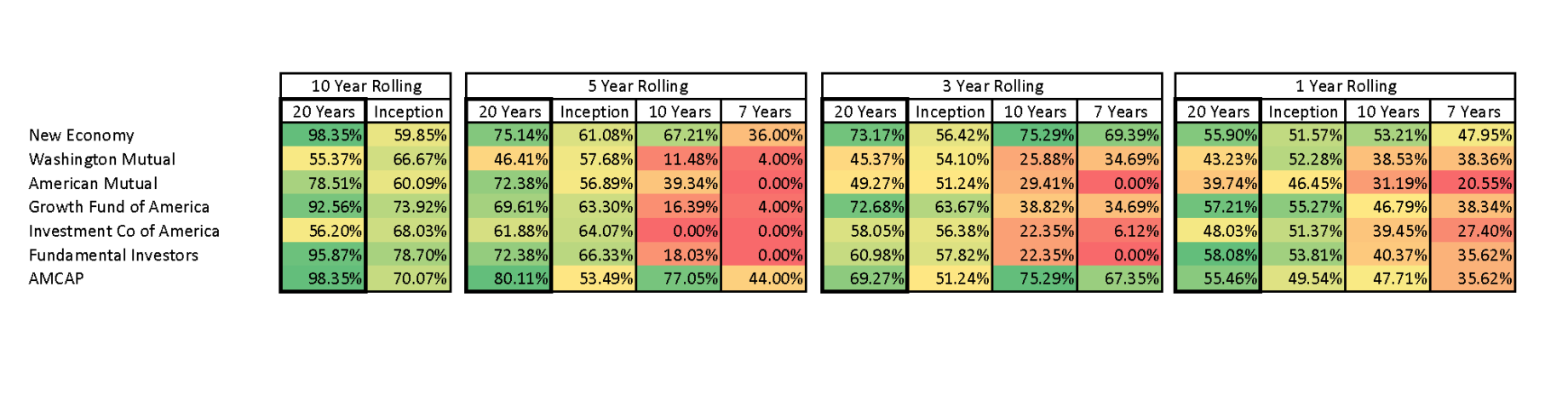 Pick Good Funds Posted on October 25, 2016April 13, 2017 By Matt The Wall Street Journal and the financial community have been abuzz about passive investing. I wrote about settling for average and outrunning a bear via active management previously. The newest argument for choosing active management over passive is that investors should choose ‘good’ managers, not average or bad managers. Why didn’t anyone think of that before? Choosing a good manager sounds like common sense, but really this is an attempted rebuttal of the fact that benchmarks outperform 70-80% of actively managed funds. Capital Group (parent company of American Funds) even published a scorecard in a sort of homage to S&P’s SPIVA report that touts the performance of ‘good’ funds. Tim Armour, chairman of Capital Group, asks why an investor would buy Blockbuster stock in the early 2000s when they could have bought Netflix – the assumption being that a good manager would have bought Netflix while an index would have been forced to ride Blockbuster into the grave. Sure, the benchmark beats bad and average managers, but the good ones rise to the top and stay there, right? If you have been following this website at all, you already know how this ends. So what happens when we screen for ‘good’ managers? American Funds suggests that active funds with low expenses and have managers that invest their own money in their own firm’s funds are ‘good’. In the US Large Cap Equity space, seven American Funds passed this hurdle. Why does one fund company have seven different funds investing in the same asset class? That’s a question for a different day. For now, let’s accept that these seven funds are ‘good’ and take a look at how they stack up against the S&P 500 (this is the bogey shown on the American Funds Active Scorecard). By the way, these funds are good. They consistently rank at the top of their peer groups and the American Funds investment process is excellent. My conflict is with the idea that picking a manager that consistently beats the market is easy and also with the data Capital Group is using to back up their argument. The Active Scorecard shows that over the last 20 years (ending 6/30/2016) the seven funds each beat the S&P 500 more than half the time over 10 year rolling periods. Four of the funds beat the index over 90% of the time! One fund won almost 80% of the time while the other two funds did a bit better than a coin flip. Over 5 year rolling periods (shorter time frame, more data points) for the last 20 years, the results come down to earth a bit with 5 out of 7 funds beating the index 70% of the time or more. One fund beat the index 64% of the time and the other beat the index 48% of the time. This is still good! Over 3 year rolling periods, the results become mixed. Two funds beat the index more than 70% of the time, two beating more than 60% of the time, one beating 58% of the time, and the other two funds beating the index 50% of the time or less. None of the ‘good’ American funds beat the index more than 60% of the time over 1 year rolling periods. Three of the funds won less than 50% of the time. At first glance, it looks like these good funds achieved good results relative to the S&P 500 on a consistent basis. Something interesting happens when we change the timeframe, though. I ran the numbers through Morningstar Direct (as of 9/30/2016, so they’re a little different from the Active Scorecard) and performance drops off, in some cases tremendously. Percentage of rolling periods funds beat the S&P 500. Data from Morningstar Direct If we look at the last 7 years instead of 20, the ‘good’ American funds get trounced by the S&P 500. The last 7 years covers the recovery from the bottom of the financial crisis. Active management is supposed to help during downturns so maybe 7 years is not a long enough timespan. Over the last 10 years, the results aren’t much better, but they are better. Seeing a pattern, I looked at rolling periods since each fund’s inception. If the pattern holds, the American Funds should dominate the S&P 500 over periods longer than 20 years, right? Since inception results only improved for two out of the seven funds. The other funds saw dramatic drop-offs from their 20-year showings. It looks like the American Funds had a great run from 1996 through 2006, but have struggled to keep up with the S&P 500 since then. My initial conclusion was that it has become more difficult to beat the index due to an increasingly efficient market and alpha decay, but the funds’ struggles before 1996 don’t confirm that. These results don’t surprise me. For active large cap managers as a whole, the S&P Persistence Scorecard shows that 8.5% of the top quartile were able to maintain their top-quartile ranking over three years (as of August 2016). Less than one percent were able to maintain a top quartile ranking over five years. What this means is that while 20-30% of active managers outperform their benchmark in any given year, it tends to be different managers each year. This is what makes picking ‘good’ managers so difficult. There’s a new crop of outperformers every year. To make things even harder, according to new research from First Eagle Investment Management investors stick with an equity mutual fund for 3.8 years. Investors need a solid financial plan or else they may find themselves sold a product due to its 10 year returns, but then acting on short term turbulence. Oh, and for the record, Netflix dropped 76% from January 2004 through March 2005 in response to Blockbuster entering the mail-delivery movie space. It recovered from that drop by April 2008 then nosedived 80% from July 2011 to September 2012 before recovering a year later. Tim Armour says “you don’t need 20/20 hindsight to have made the right call”. Tell that to Netflix founder Reed Hastings who tried to sell his company to Blockbuster for $50 million in 2000. Apple stock was 